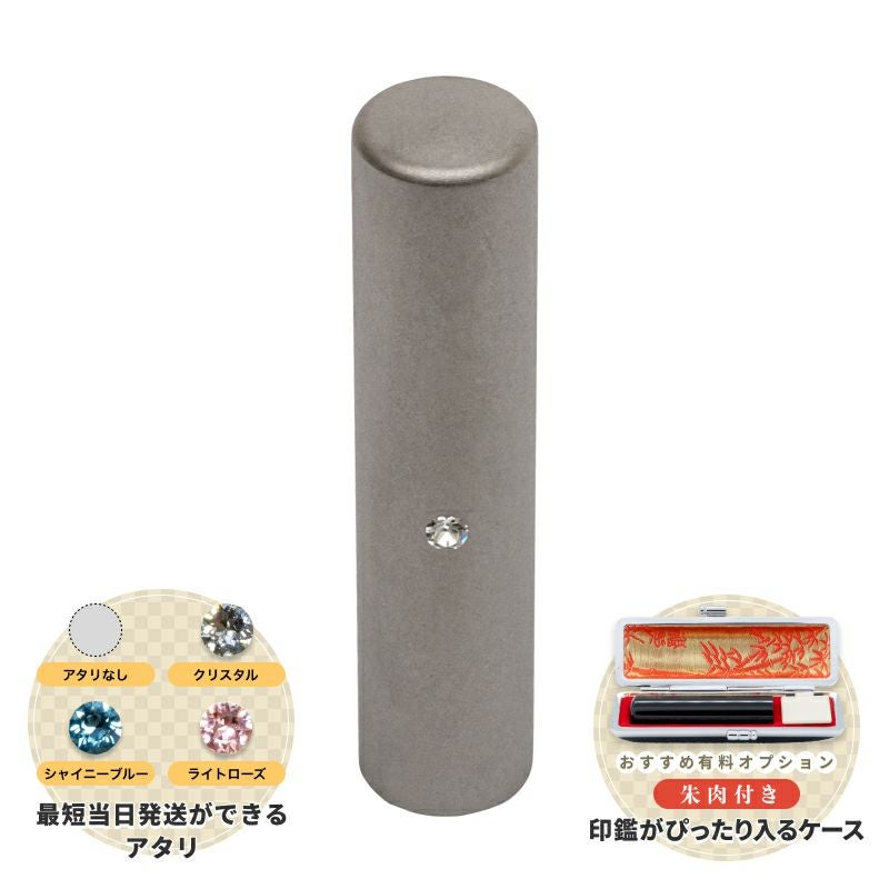 法人 銀行印 『ブラストチタン』です。こちらの製品は、サンドブラスト加工を施したボディが特徴の印鑑で、マットな質感が人気の定番商品です。手に触れるとすべすべとした感触が心地よく、スタイリッシュな雰囲気が魅力的です。特に若い世代に支持され、人気が上昇しています。また、ブラストチタンには、印面の上下をわかりやすくする「アタリ」(+500円)を追加することも可能です。