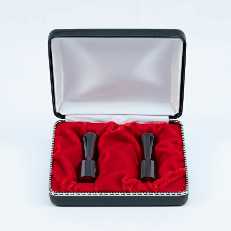 法人用【実印・銀行印】の2本セット(実印18.0mm・銀行印16.5mm)です。こちらの印材は『ブラックチタンミラー』を使用しています。シックな雰囲気を演出し変色や色落ちすることのない、重厚で存在感のあるブラックコーティングがその魅力です。チタン印鑑に使用されるチタン金属は、宇宙工学に不可欠な先進のマテリアル超金属として活躍しています。その強度、耐食性、耐久性は、不可欠な特性です。化粧ケースに入れてお届けいたします。
