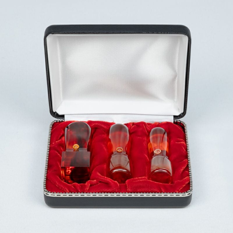 法人の立ち上げ時に必要な印鑑3本セット(実印18.0mm・銀行印16.5mm・角印21.0mm)です。こちらの印材は『琥珀樹脂』を使用しています。数千万年から数億年前に地上に繁茂していた樹木の樹脂が化石化したもので、「樹脂の化石」と呼ばれる芸術品です。軽くて手になじみ、夏は涼しく、冬は温かいというのは、琥珀だけが持つ特徴です。何千万年もの時間を経て化石となった針葉樹の樹脂は、美しい輝きと神秘的な色合いを持ち、本象牙に匹敵する高級印材として愛されてきました。※琥珀印鑑は強度を保つため、琥珀と高硬度の人口樹脂を合成し強度を高めて成形されています。化粧ケースに入れてお届けいたします。