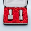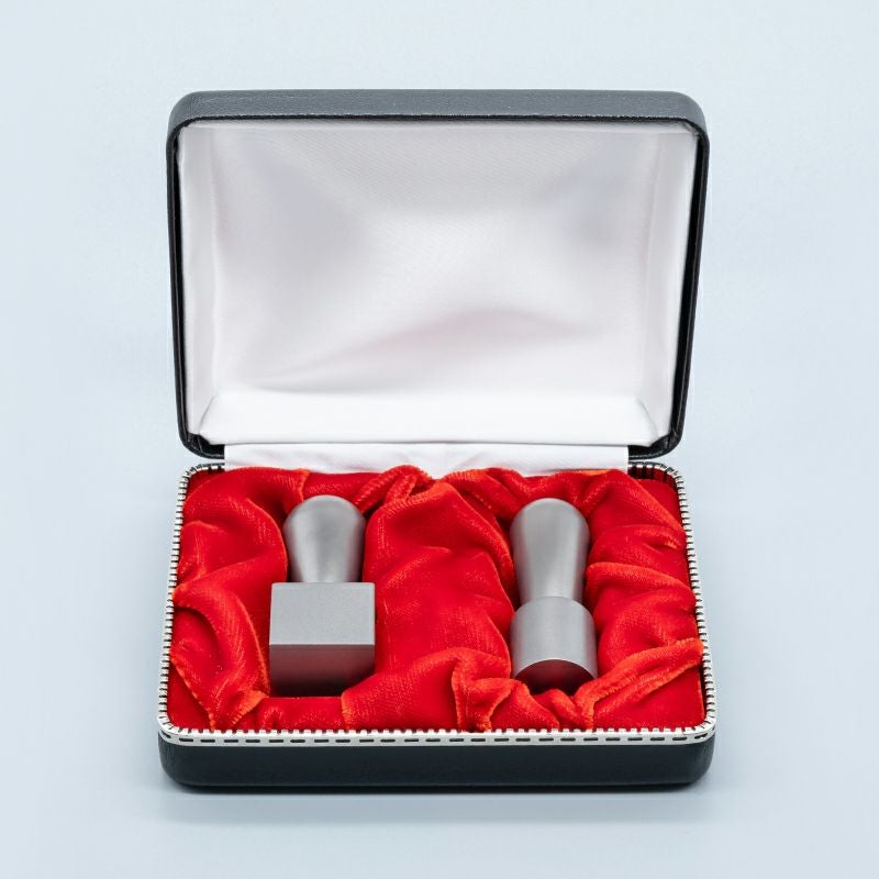 法人の立ち上げ時に必要な印鑑2本セット(実印18.0mm・角印21.0mm)です。こちらの印材は『ブラストチタン』を使用しています。こちらの製品は、サンドブラスト加工を施したボディが特徴の印鑑で、マットな質感が人気の定番商品です。手に触れるとすべすべとした感触が心地よく、スタイリッシュな雰囲気が魅力的です。特に若い世代に支持され、人気が上昇しています。また、ブラストチタンには、印面の上下をわかりやすくする「アタリ」(+500円)を追加することも可能です。化粧ケースに入れてお届けいたします。