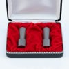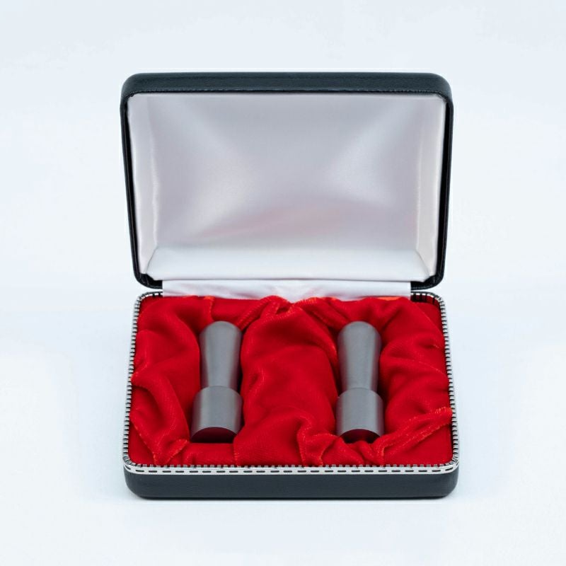 法人用【実印・銀行印】の2本セット(実印18.0mm・銀行印16.5mm)です。こちらの印材は『ブラストチタン』を使用しています。こちらの製品は、サンドブラスト加工を施したボディが特徴の印鑑で、マットな質感が人気の定番商品です。手に触れるとすべすべとした感触が心地よく、スタイリッシュな雰囲気が魅力的です。特に若い世代に支持され、人気が上昇しています。また、ブラストチタンには、印面の上下をわかりやすくする「アタリ」(+500円)を追加することも可能です。化粧ケースに入れてお届けいたします。