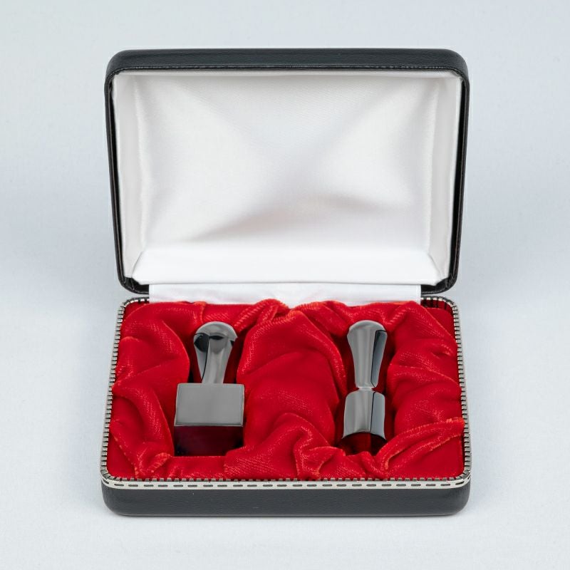 法人の立ち上げ時に必要な印鑑2本セット(実印18.0mm・角印21.0mm)です。こちらの印材は『ブラックチタンミラー』を使用しています。シックな雰囲気を演出し変色や色落ちすることのない、重厚で存在感のあるブラックコーティングがその魅力です。チタン印鑑に使用されるチタン金属は、宇宙工学に不可欠な先進のマテリアル超金属として活躍しています。その強度、耐食性、耐久性は、不可欠な特性です。化粧ケースに入れてお届けいたします。