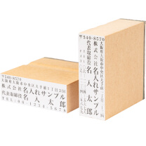 「親子印」「分割印」とも呼ばれる住所印のレイアウトです。住所や電話番号などの情報が変更となった際はその行だけを差し替えたり、社名を一番上にするなどのレイアウト変更が可能なだけでなく、必要な行を一行印として使用もできるため、利便性が高く経済的です。
